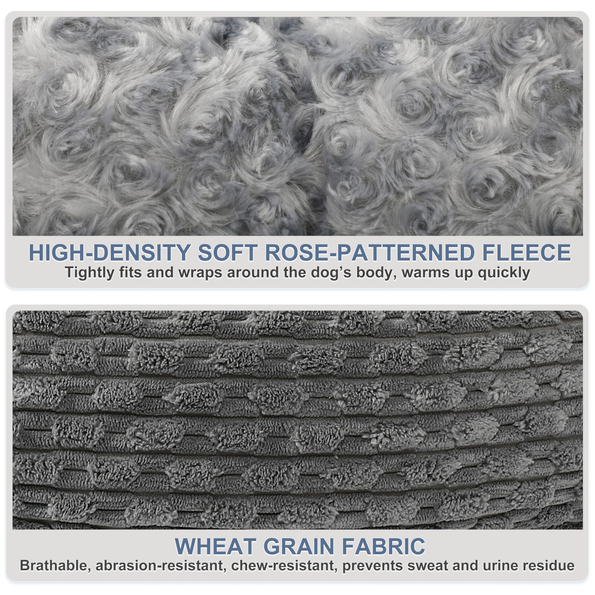 The interior of the bed is lined with rose fluff that gently wraps around your dog’s body, offering a skin-friendly, snug fit. This soft material raises the temperature quickly, allowing your dog to relax and sleep soundly. The exterior features breathable, wear-resistant wheat grain fabric, which is both durable and visually appealing. It prevents the buildup of sweat and odors, ensuring a clean, fresh environment for your pet.