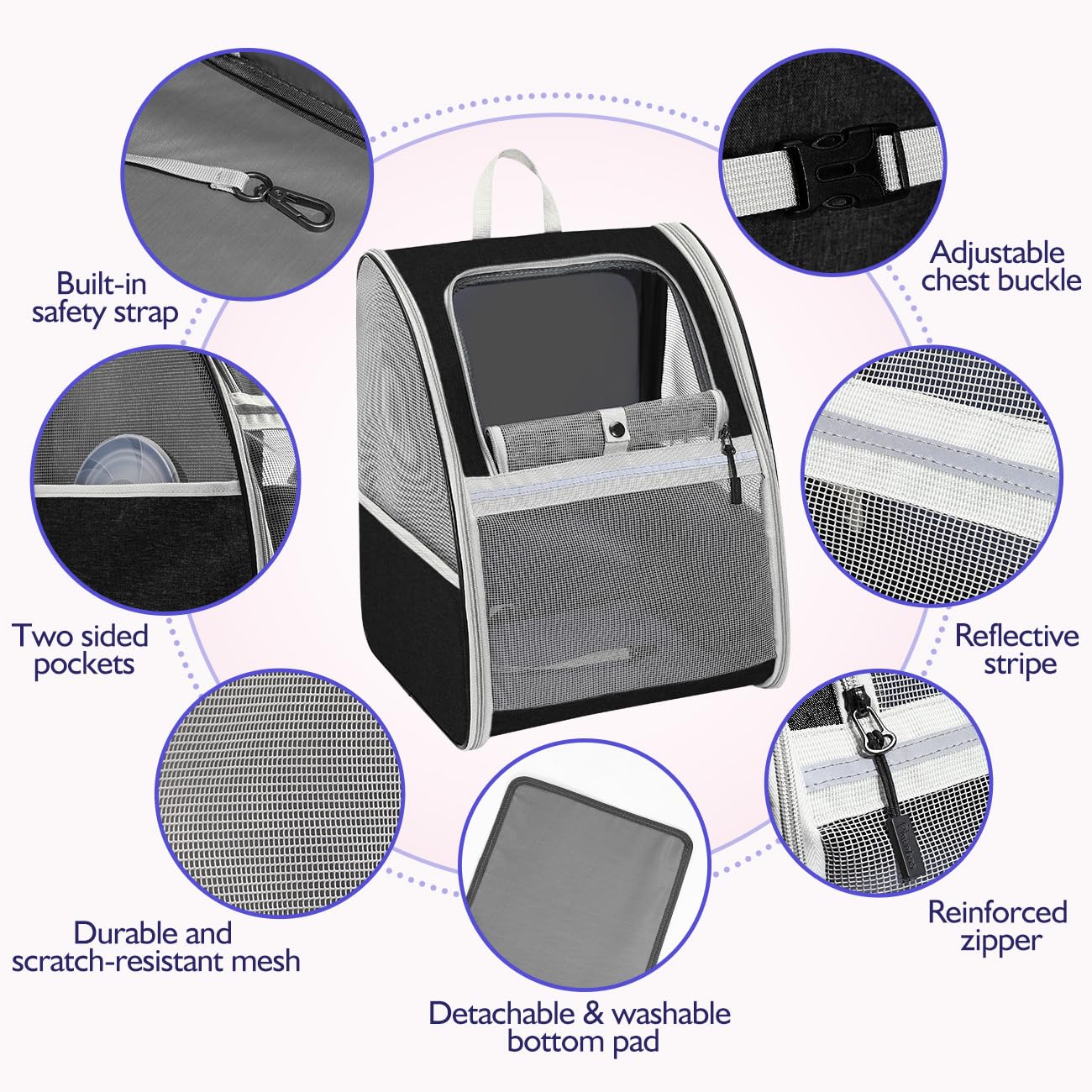 - 【GREAT BREATHABLE & VISIBLE】The puppy carrier is made of mesh fabric on three sides, strong air circulation for breathable and cool. Through the transparent mesh of this small dog carrier backpack, you can clearly view the status of pet, and your furry friend inside the cat bag carrier also observe the outside. The top of cat bag can be opened, and pets can extend their heads to satisfy curiosity.