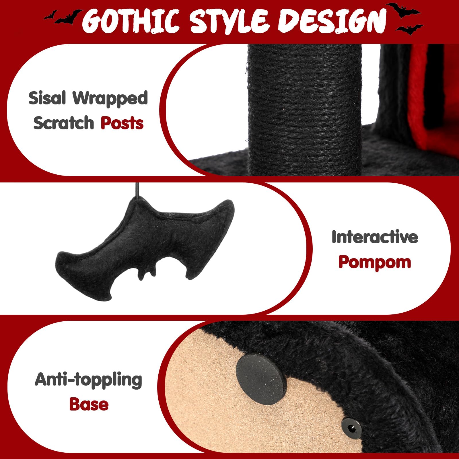 - 【Goth Cat Tree】 This red and black cat tower features classic gothic elements like a hanging bat ball, coffin bed, sisal scratching posts and more. It can effortlessly catch cats and people’s attention and create a spooky atmosphere for your home decor.