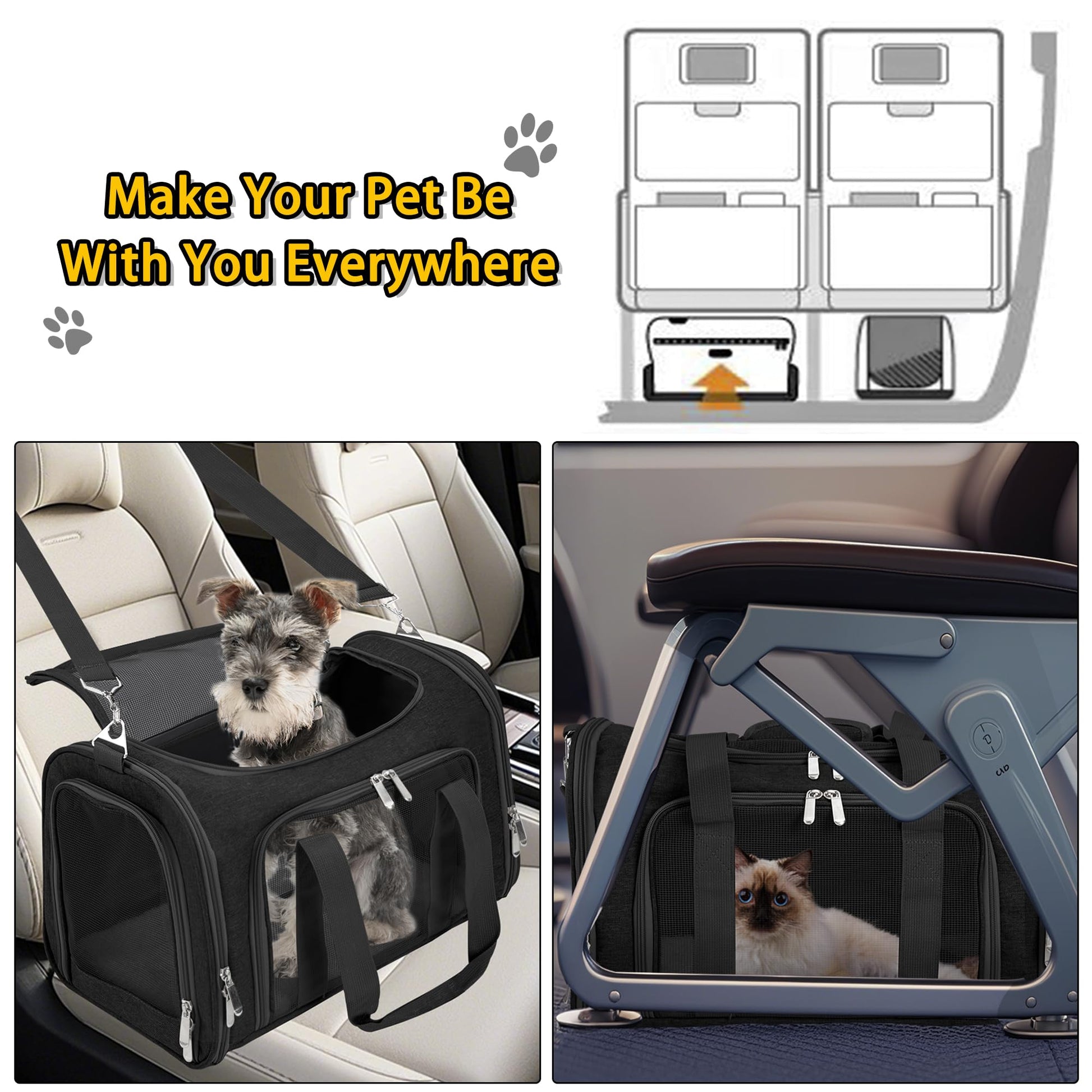 - Airline Approved & Safty:Can be placed under the seats of most airplanes(Four non-slip feet on the bottom to prevent movement), and comfortably on the seat next to you in a car or bus. Has a adjustable shoulder strap. Can also be fastened to the car seat with a safety belt or shoulder strap to keep your pet safe.